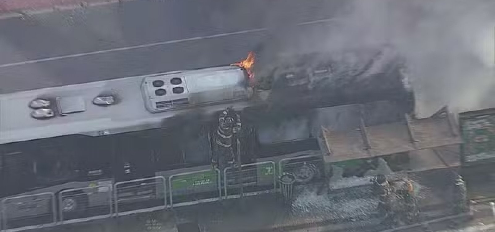Um ônibus e outros veículos atingidos pelo avião pegaram fogo após a queda. A via permanece interditada.